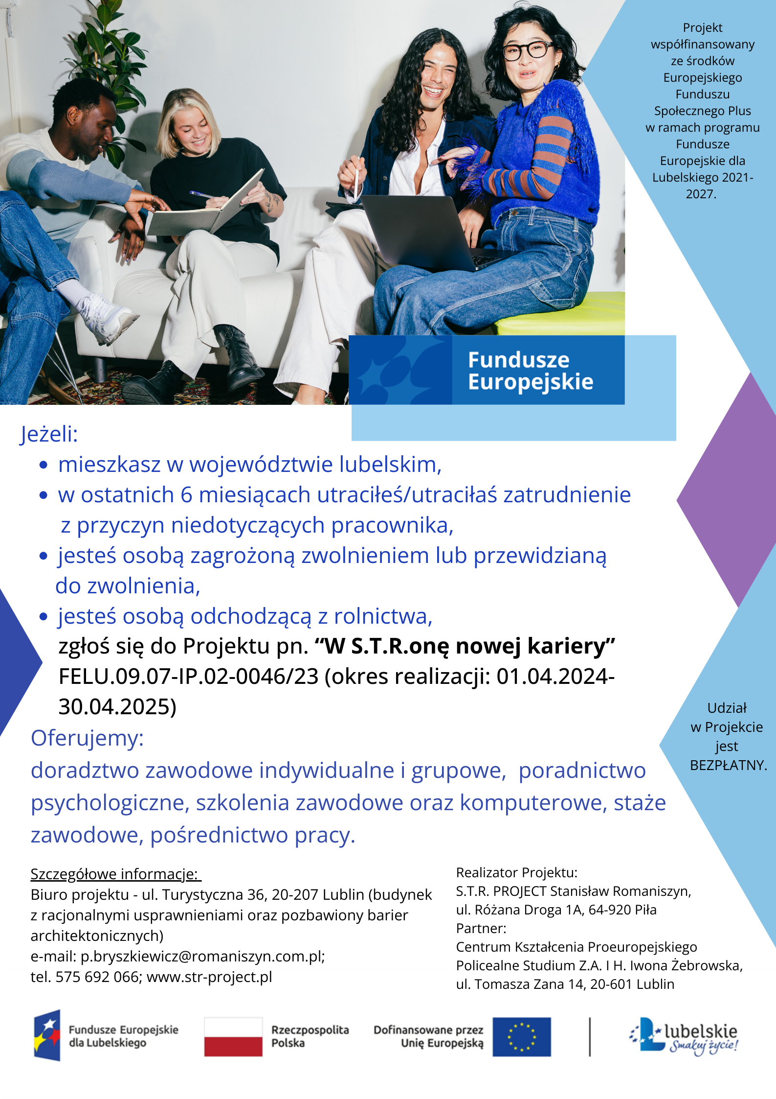 S.T.R. PROJECT Stanisław Romaniszyn w partnerstwie z Centrum Kształcenia Proeuropejskiego Policealne Studium Z.A. I H. Iwona Żebrowska zapraszają do udziału w projekcie pn. „W S.T.R.onę nowej kariery”, nr FELU.09.07-IP.02-0046/23 realizowanym na OBSZARZE WOJEWÓDZTWA LUBELSKIEGO.
