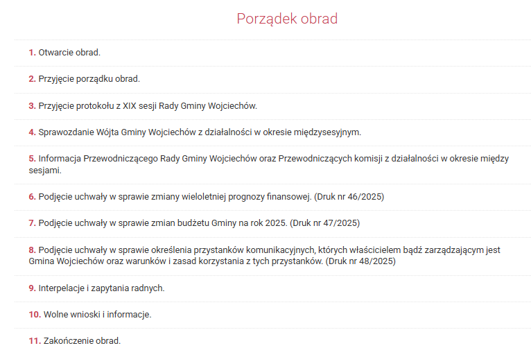 XX Sesja Rady Gminy Wojciechów w dniu 29 sierpnia 2025, godz. 09:00 Gminny Ośrodek Kultury w Wojciechowie