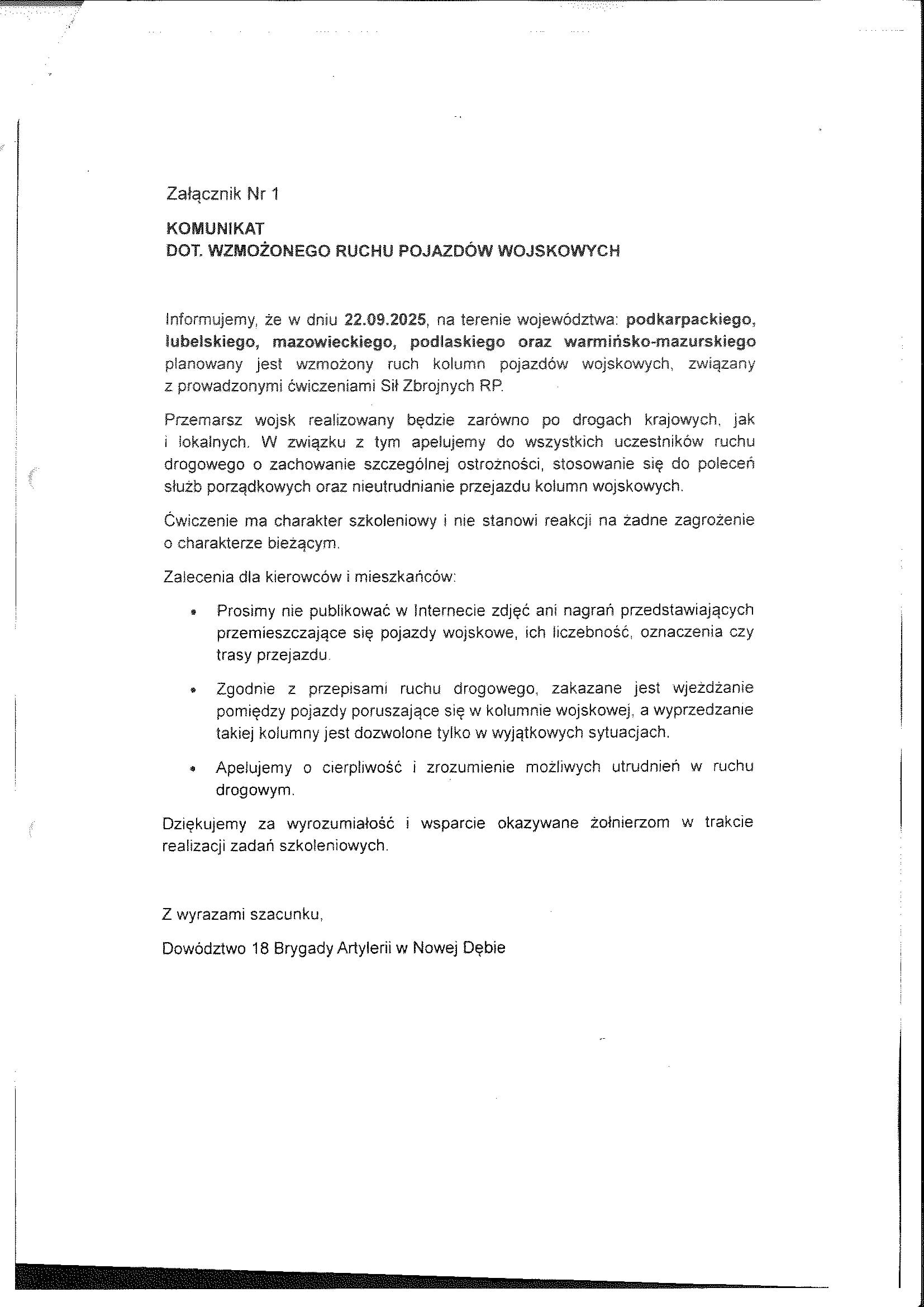 Komunikat dot. wzmożonego ruchu pojazdów wojskowych w dn. 23.09.2025